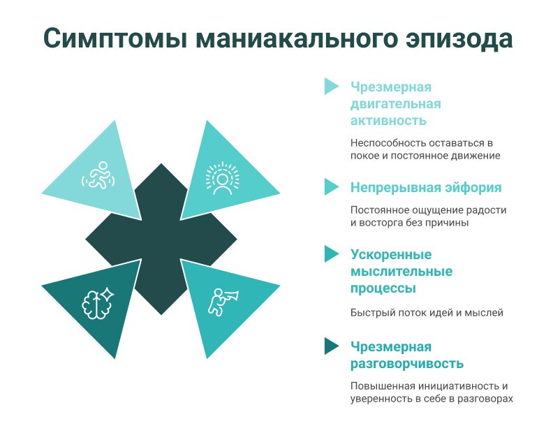 Тяжёлая мания – самая опасная стадия. В этот период у пациента может возникнуть психомоторное возбуждение, когда движения становятся резкими и бесконтрольными, а речь – сбивчивой, бессвязной. Мысли путаются, наблюдаются признаки психоза: бредовые идеи, галлюцинации, ощущение собственной исключительности или особой миссии. Человек может считать себя великим реформатором, гением, избранным. Он теряет связь с реальностью, перестаёт осознавать опасность своих поступков, нуждается в срочной медицинской помощи.